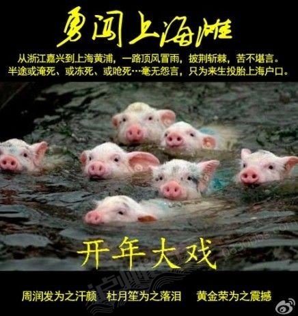 是年三月,浙猪入沪,因路资奇高, 群猪择水而行,不料雾大水污,皆毒 毙,遂漂流而至,沪上大惊,忙捞之 ,测水质,曰水质尚佳,只增肉香也 。群猪升天,乐道:终得沪籍,不枉此生。 俗称