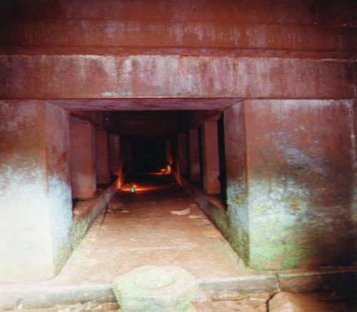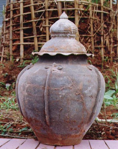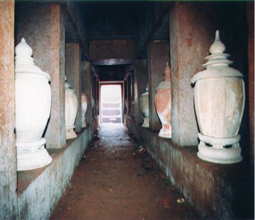 沿洞口八级阶梯而上,在距该洞不远处杂草丛中,隐藏着另一个石洞。这个山洞和第一个山洞结构相似,只是在山洞中,多了不少圆形的石板。石板直径约一米,有的石板上残留着燃烧后的灰烬。洞口没有大门,但是在洞的尽头却有两扇并排的石门,其中一扇已经毁坏,另一扇则保存完好。打开石门,在两侧石龛上整齐排放着两排坛子。坛子大小不一,造型粗看相似,细节却有不尽相同,每个坛子上还刻有文字。坛子里究竟装的是什么?装了多少年了?究竟是什么人装进去的?……一个个迷团在我脑中萦绕。这时,与我同路的一位熟悉情况的当地人为我解开了迷团。原来,在古代,僧侣死后按照风俗必须进行火化,火化后的骨灰将被装进特制的坛子里。那么,当时的和尚为什么要将陵墓建在地下呢?当地群众口中流传着三种不同的说法。
