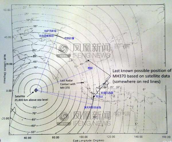 也就是说,根据设在英国伦敦的国际海事卫星技术中心提供的数据,MH370航班最后在8点11分与卫星通联的天线角度是40度,以卫星定点的位置计算,得到了飞机大致下落可能所在的弧形。