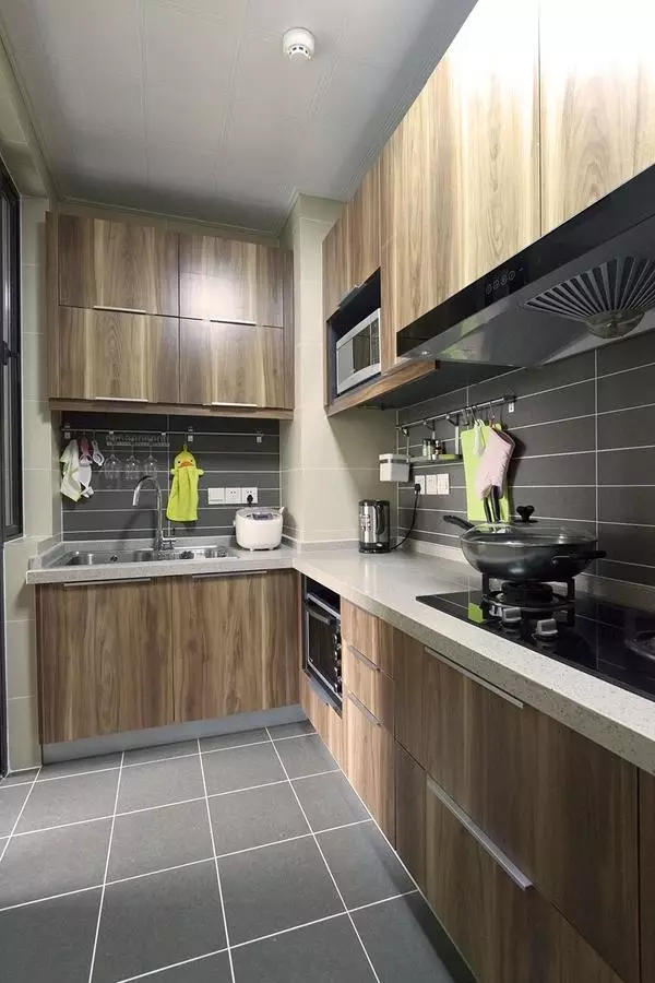 ▲ 厨房专门铺贴了耐脏的灰色地砖和墙砖,L型橱柜将将电器完美收纳。