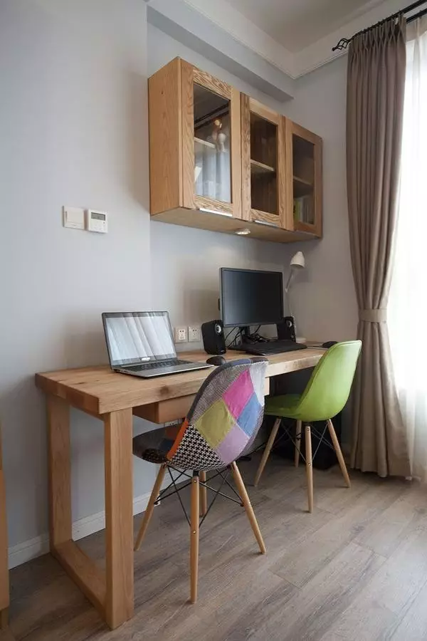 ▲ 阳台改造成了双人办公区。桌子上方的置物柜安装了柜门,避免灰尘的落入。