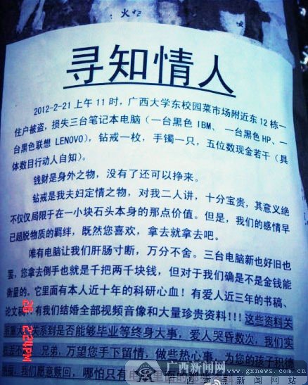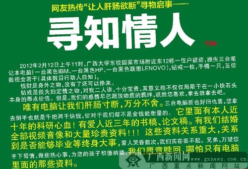 近日,一则寻物启事贴在了广西大学的校园内,立马被网友拍下并发至网络。短短几天内,这条被网友堪称“看了肝肠欲断”的寻物启事引起不少关注,网友们通过QQ、微博多次转发,希望能帮助失主找回丢失的东西。