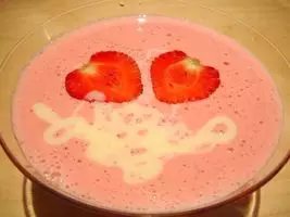 草莓豆腐奶 材料: 嫩豆腐1块草莓450克 蛋白2个鲜奶1/4杯 奇异果1个 炼奶少许 调味料: 盐半茶匙、生粉半汤匙、草莓香油数滴 做法: ① 将草莓(225克)、豆腐、蛋白、鲜奶全放入搅拌机内拌匀,取出后混和调味料,放入碟内,上层饰以草莓及奇异果,然后放进微波炉内,高火煮约3分钟即成。 ② 取出后倒去水分,淋上少许炼奶。