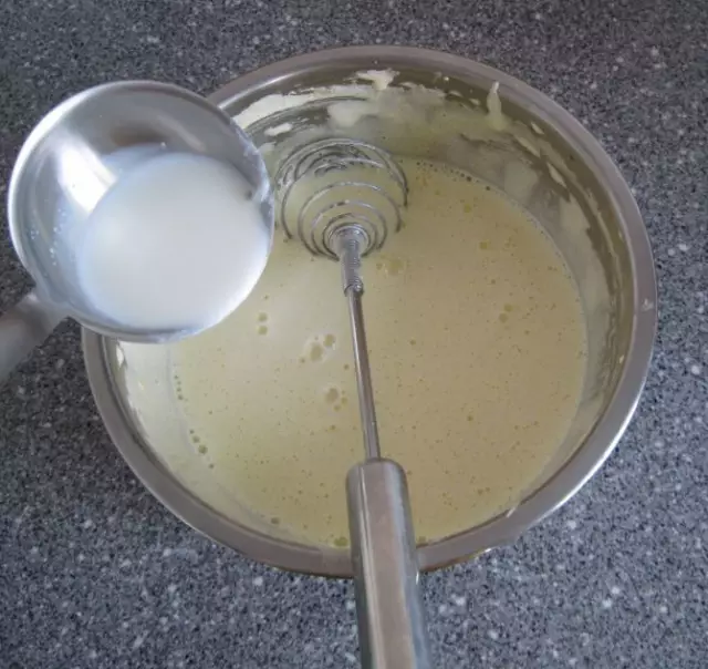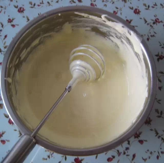 家庭自制冰激凌 1.取4个鸡蛋的蛋黄,打散。超市有专门的分蛋器卖,很好用,蛋黄旁边粘的蛋青越少越好。蛋青保留备用双皮奶。 2.250mL蒙牛牛奶,用小锅加热,不要煮至沸腾,看表面刚刚有气体冒出来。 3.小火,搅拌下缓慢将打散的蛋黄加入,牛奶和蛋黄可以完全混合,再加入1-2勺玉米淀粉,继续搅拌,至完全均匀。冷却。 4.150g 雀巢淡奶油,加3-4勺糖,用打蛋器打发。 5.待3所得的东东完全冷却后,将4缓慢倒入。 6.用打蛋器的另一个搅拌棒搅拌均匀,放入冰箱中。每40分钟搅拌一次。 7.可在第2次或第3次搅拌时加入喜欢的口味,例如绿茶,绿豆,草莓酱等。